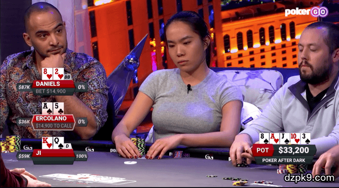 Ercolano在HJ位用A♠5♣溜入(limp),Ji在按钮位用K♥Q♠加注到$1,000,大盲位的Daniels用8♥2♥跟注,Ercolano也跟注。
