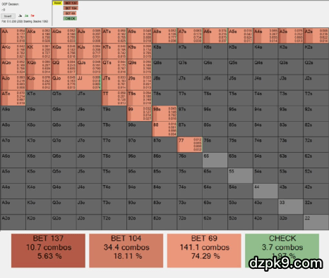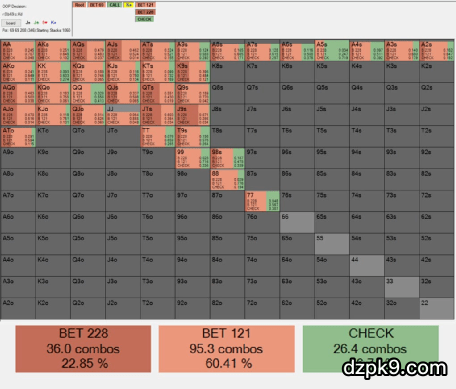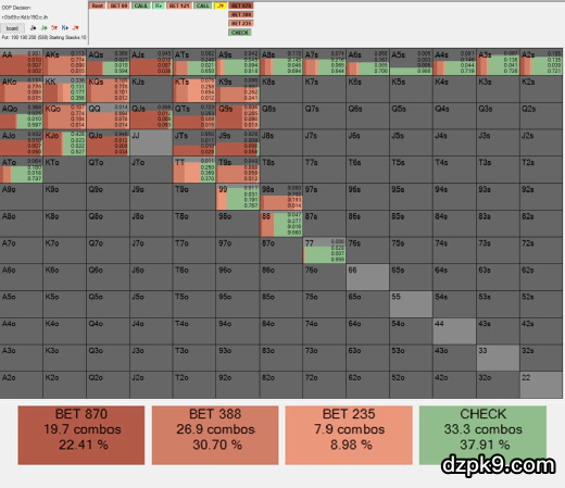 Solver也赞成Fried的做法,从下图可以看到,它c-bet率接近100%,且多数是下一个小注。