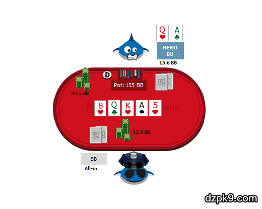 牌面8♥Q♣K♥A♠5♥,底池155bb,SB位全下32.5bb,BTN位跟注。