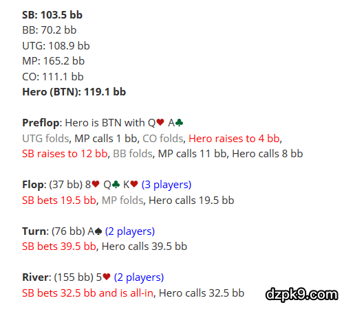 翻牌:8♥Q♣K♥,底池37bb,SB位c-bet了19.5bb,MP位弃牌,BTN位跟注。
