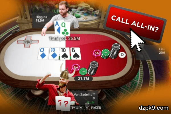 考虑了3分钟后,Higgins最终选择跟注,由于ICM的影响,这个决定非常难做,因为Van在拿着K♦9♦、J♦9♦、8♦9♦、K♠J♠、J♠9♠或9♠8♠这些听牌时也会采用这一策略,但尽管Van有可能这么做,Higgins选择跟注对方全下的做法还是错了。