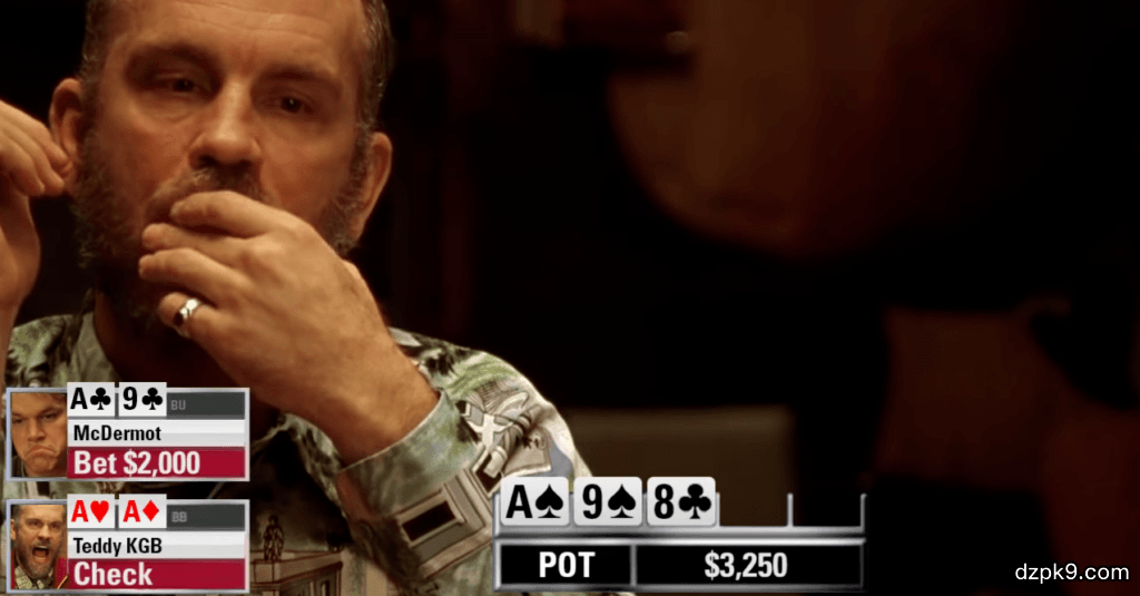 Van的形象很凶这一点肯定让他的选择是倾向加注的,而Dara还指出Higgins看起来很满意自己的牌力,且Van的牌不包含AA和AQ的阻隔牌。