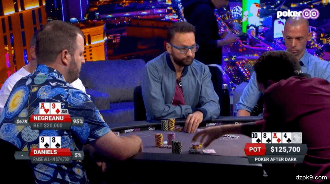 Daniels思考了几秒钟,宣布全下。丹牛似乎有点惊讶,他迅速要求数筹码。