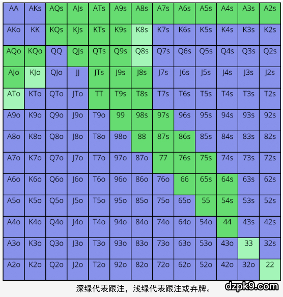 一般而言,作为3bet底池有利位置防守者,你应该用范围中许多牌继续游戏,特别是你在对抗厉害的激进牌手时。在本例中,Fried应该用下列牌继续游戏: