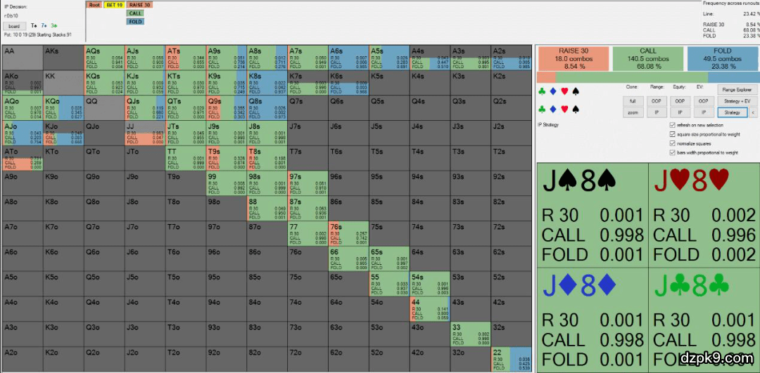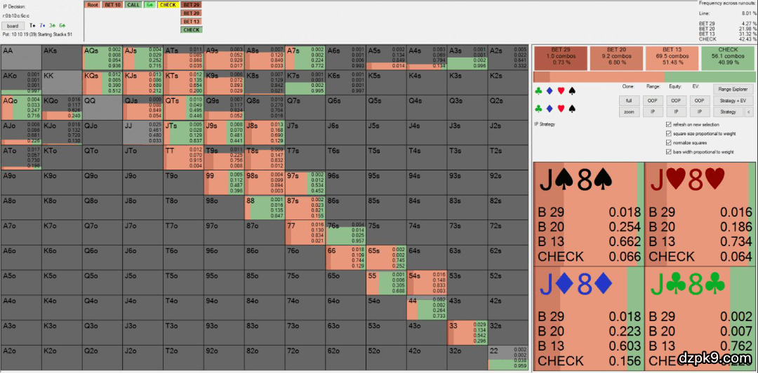 Solver软件在河牌圈用破灭的顺子听牌(A5,A4,K9,Q9,J9,J8)和一些到达这里的高牌(AQ、AJ、KQ、QJ)诈唬。Fried的特定底牌J♥ 8♥在Solver中以96%的频率下注。下注尺度是全压。