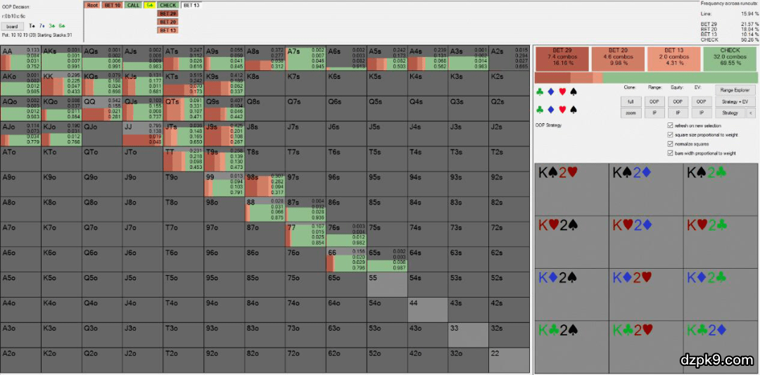 当smcommerce check时,他的范围由许多将被迫对下注(即使是个小注)弃牌的高牌构成。因此,也因为Fried的范围包括许多需要保护的牌,可使用的最好下注尺度是一个小注(33%底池大小)。