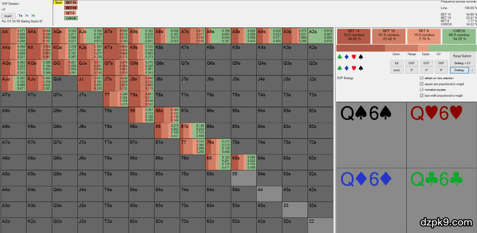分析:因为他的范围比Fried的范围强很多,smcommerce应该在这个翻牌面极频繁地下注。虽说如此,他使用了一个适当大的下注尺度(至少对于一个3bet底池的干燥牌面是比较大的),这可能暗示他有一个较强的下注范围。当他使用这种尺度的下注时,如果没有该牌手的更多信息,很难说他的范围是否平衡。在smcommerce的场合PioSolver喜欢以很高的频率做大尺度下注。
