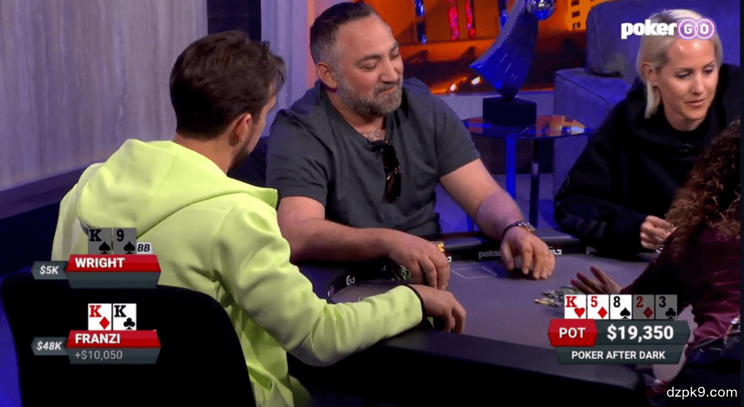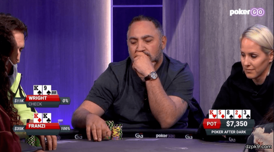 翻牌发出K♥5♦8♠,Franzi中顶暗三,Wright击中顶对。