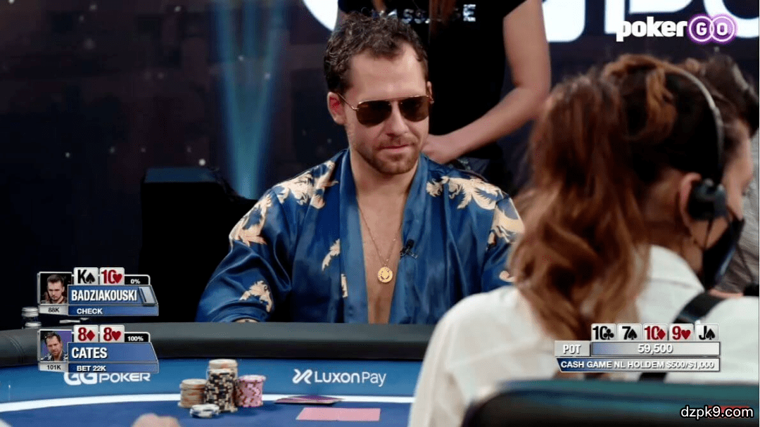 两家打进翻牌圈,翻牌发出10♣7♠10♦,Badziakouski击中三条10,而野人击中顶两对,此时他不可能弃牌。