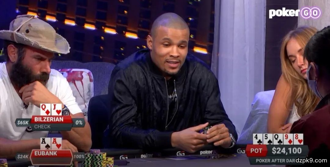 “我有一张Q,”土豪丹说。话音刚落,Eubank秀出口袋A,众人惊呼,土豪丹给了个大大的微笑。就这样,Eubank拿走了这个$24,100的底池。