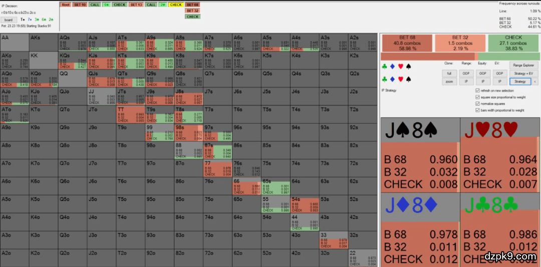 Solver软件在河牌圈用破灭的顺子听牌(A5,A4,K9,Q9,J9,J8)和一些到达这里的高牌(AQ、AJ、KQ、QJ)诈唬。Fried的特定底牌J♥ 8♥在Solver中以96%的频率下注。下注尺度是全压。