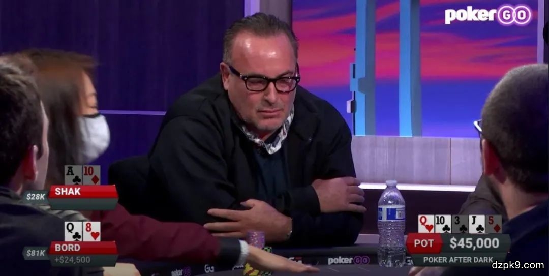 翻牌是Q♥10♣3♣,Bord击中顶对,Shak击中中等对子+顶跟张以及听后门同花。