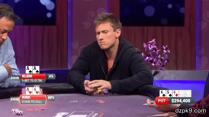 翻牌5♠4♣4♦,底池44,400,Klein下30k,Kirk加到75k,Roberts弃牌,Klein反加到175k,Kirk跟注。