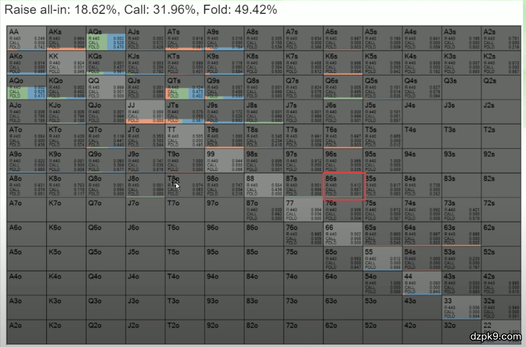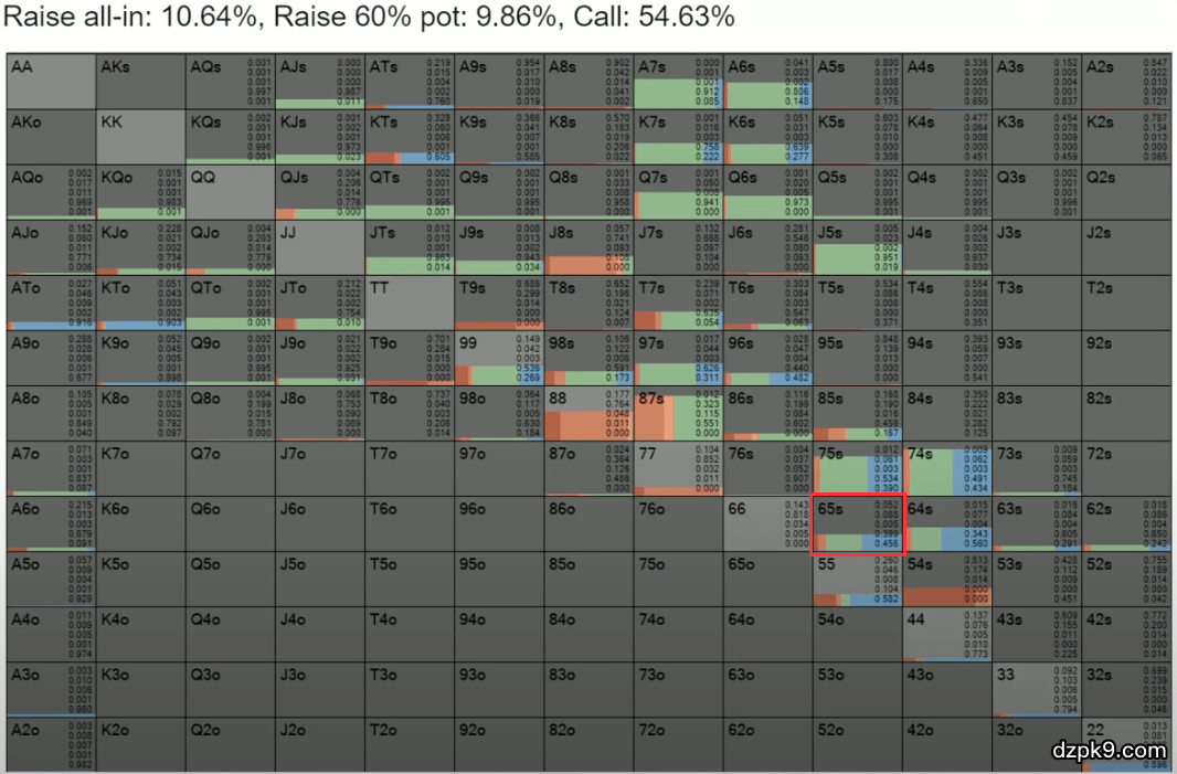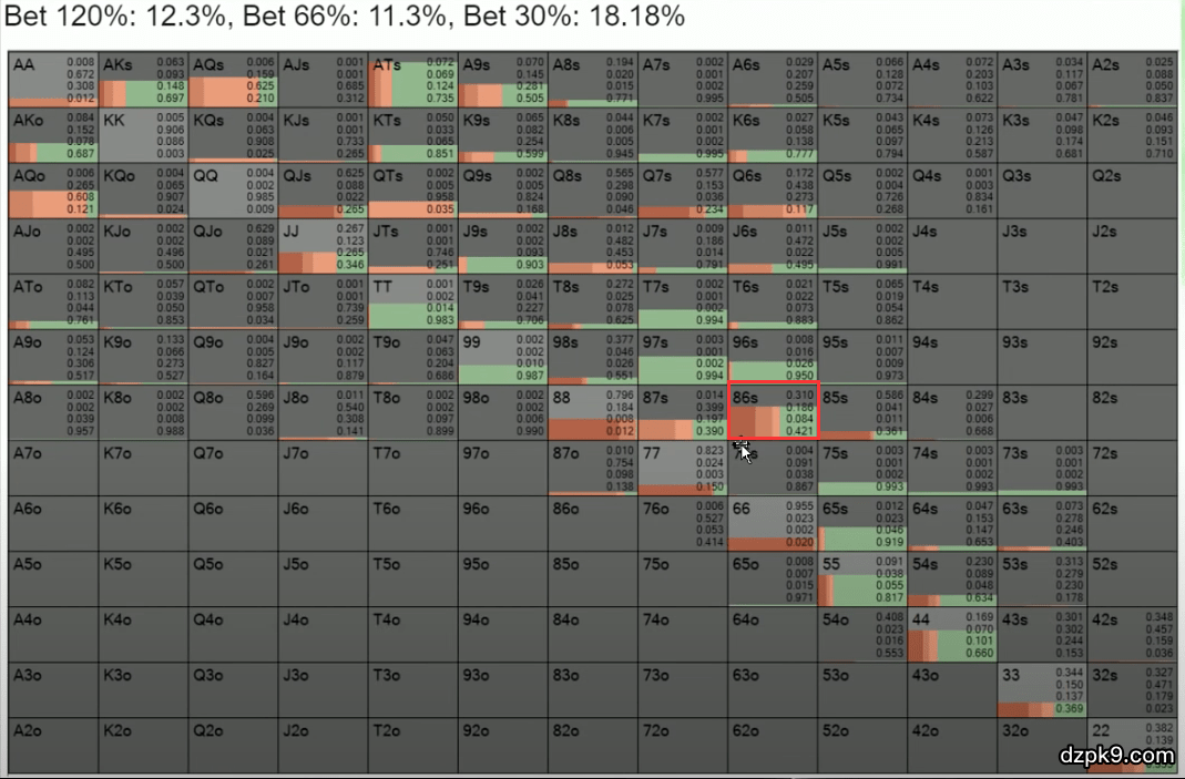 我们可以看到,根据解算器给出的Doug Polk翻牌前应该玩的手牌的范围,当他拿到86同花时,有75%的时候应该3bet。这里的0.75指的就是75%的意思。