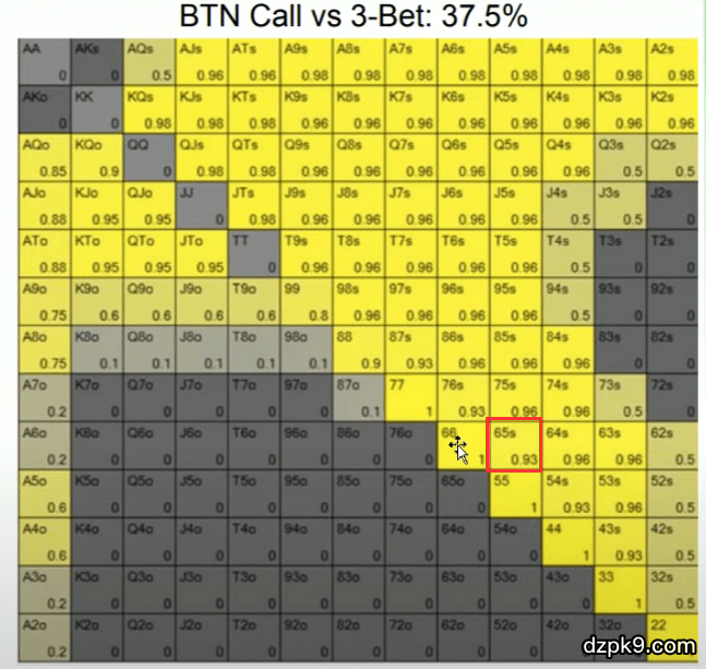 这个时候,他有93%的时候是要跟注的。偶尔还要4bet。