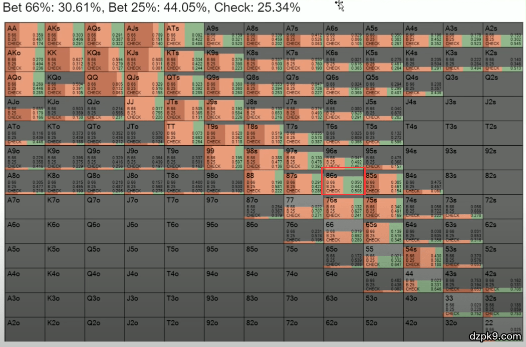 我们可以看到,Polk应该用30.61%的频率下注66%的底池,44.05%的频率下注25%的底池,还有25%的时候要过牌。