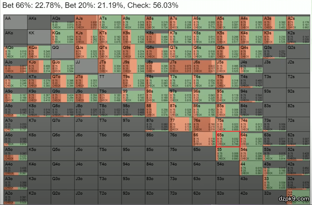 我们看到,65同花大部分时候应该过牌。