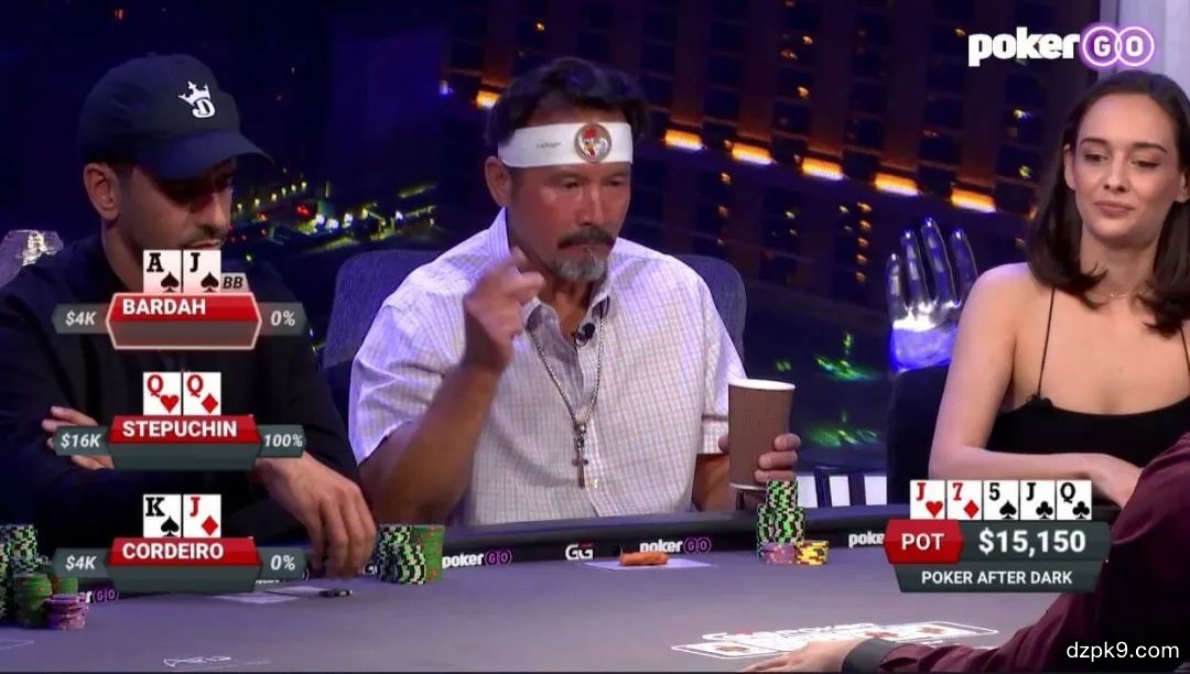 但Bardah并没有全下,他只下了底池的41%,给了Cordeiro和Stepuchin在河牌圈逆袭的机会,而河牌Q让Stepuchin真的成功逆袭了。