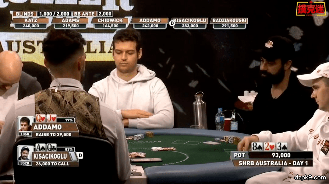 翻牌发出2♥ 3♠ 8♠,两位玩家都没有击中,但是庄位玩家在ADDAMO过牌后利用位置优势以及A♠选择下注13500,但遭到了ADDAMO的过牌加注到39500,思考过后选择跟注。
