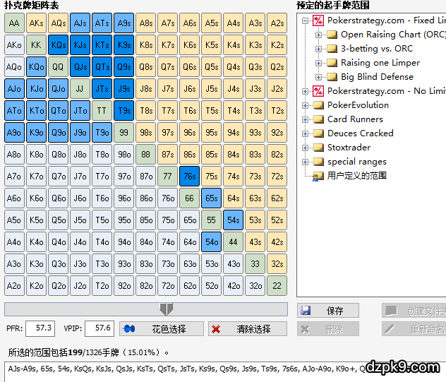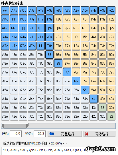 首先我们知道这个牌面相对来说还是比较干燥的,而翻牌前是庄位对CO位做的加注,所以整体的加注范围还是比较宽泛的,并不只是AA,KK这种大对子,而是有将近20%的加注范围。