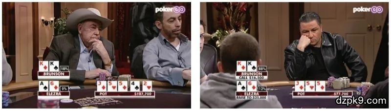 DP:没错。有太多心理方面的因素了,不考虑具体情况几乎不可能解析这一手牌。Elezra和Brunson是朋友也是对手,丹牛和Brunson也是。他们都太了解彼此了。当你的对手是已经和你打过太多牌的朋友,你们已经非常了解彼此打牌的倾向了,你偶尔就要给他们下圈套了。