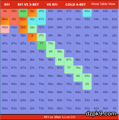 下图是上风期培训网站推荐的LJ位开局范围vs CO位3-bet范围时的做法↓↓↓