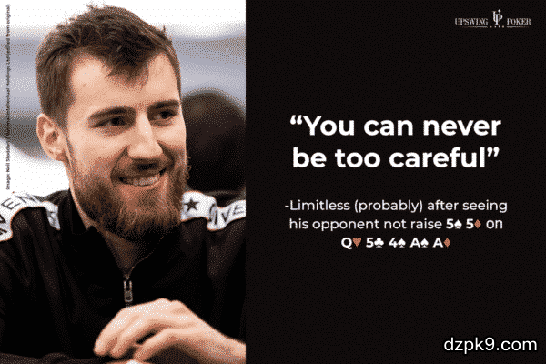 假如对手是疯玩型的人,总喜欢超池下注诈唬,那你可以用暗三选跟注,但Stefan的对手是Limitless,一个不可能犯这种错误的职业牌手,所以Stefan用暗三仅仅是跟注的做法错了。