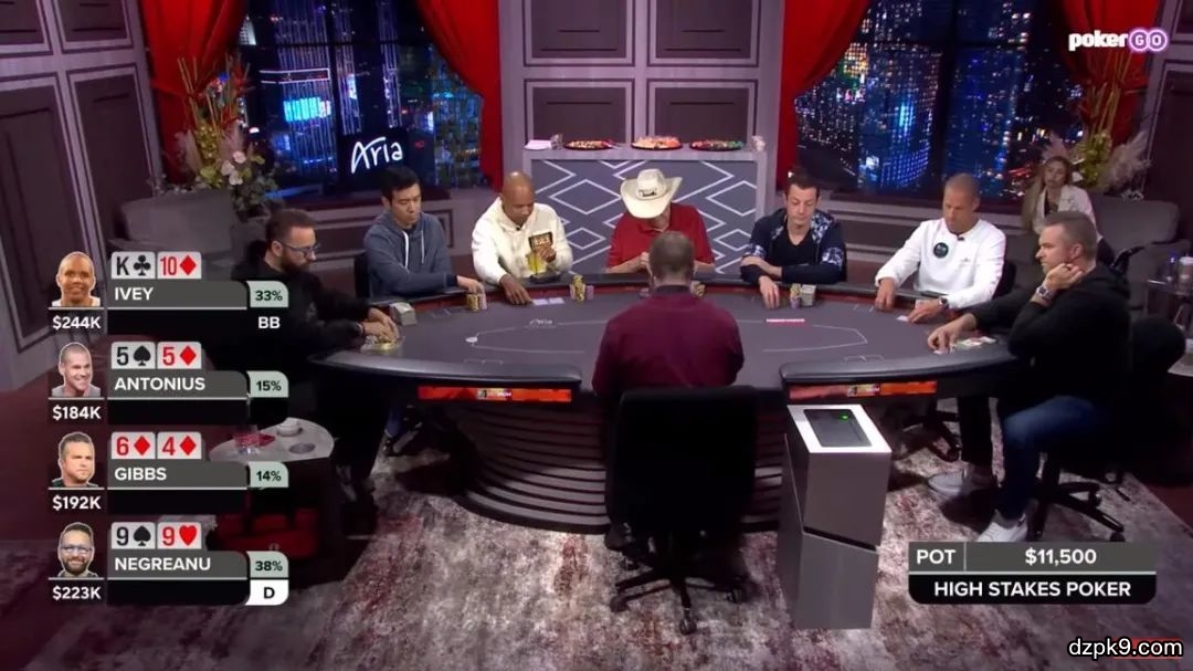 《高注额扑克》第9季第13集的嘉宾可谓是众星云集,包括Daniel Negreanu(以下简称丹牛),Patrik Antonius,Phil Ivey,Doyle Brunson,Tom Dwan,Jason Koon,Jonathan Gibbs和DoorDash创始人Stanley Tang。当晚打的是盲注500/1000美元的无限德州扑克。