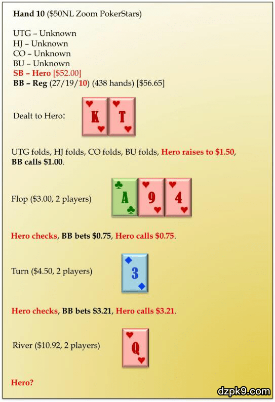 诚然,我们应该在这里用许多听牌诈唬下注,但这手牌在我们的整体策略中扮演了更重要的角色。用K♥ T♥ check扩展了我们的check范围,更具体地说,我们的check-call范围变得更完美了。我们的 check范围需要它能得到的所有帮助。我们用一些我们认为会污染我们下注范围(它必须保持整洁)的牌check-fold。转牌圈什么也没有改变,而水平较差的学生会用以下两种糟糕方式之一思考: