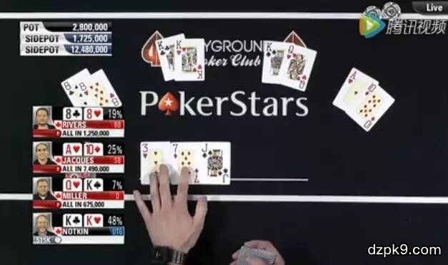 Miller(3.4bb,以下简称M.),一位是大盲注位置的Rivers(6.2bb,以下简称R.),如果他加注这两位短筹码选手将会非常警觉的弃掉很多原本可以全下的手牌,其次如果他加注将有可能和另外一位深筹码玩家Jacques(37.5bb,以下简称J.)交火,这也是他不愿意看到的情况,所以他选择了冷跟注。