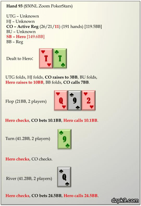 翻牌:Q♥-9♠-2♥。Hero过牌,CO位下注10.1BB,Hero跟注。