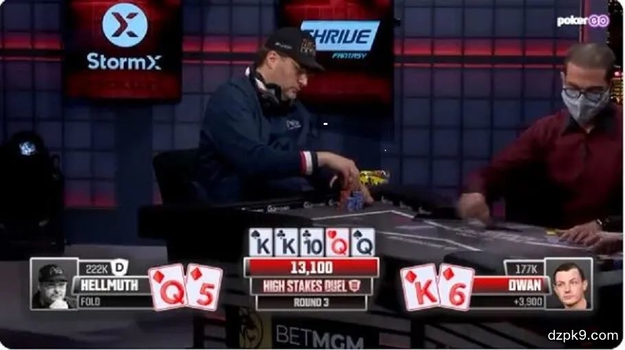 今天分析的这手牌选自Phil Hellmuth与Tom Dwan的$400,000 High Stakes Duel III第三回合的游戏,这可能是你看过的Hellmuth有史以来做过的最漂亮的弃牌。比赛前期,两人有效筹码很深,大约有287 BB,在这手牌开始前Phil Hellmuth的筹码量略多于Tom Dwan。盲注级别300/600,Phil Hellmuth在庄位用Q♦5♦跟注,Tom Dwan大盲位拿了K♦6♦过牌开牌。底池大小:2,400。翻牌K♠K♣T♣(T代表10)让Dwan中了隐蔽性很好的明三条。他过牌,Hellmuth持续下注1,500(63%底池),Tom过牌-跟注。底池大小:5,400。转牌的Q♥是一张有意思的牌,对Phil来说是一张潜在的麻烦牌,因为他现在组成了两对的牌型。Tom第二次过牌给Hellmuth,但这次Hellmuth选择后位过牌。底池大小:5,400。河牌的Q♠对Hellmuth来说简直是灾难,因为他现在组成了葫芦,但Dwan有更好的葫芦。Tom第三次过牌,Phil做了一个小的下注,往5,400底池里打了1,200(22%底池)。Dwan加注到6,500,Phil甚至都没有多思考就弃掉了手牌,Dwan只赢下一个13,100小底池。由于这是单挑,你可能会认为庄位拿到Q5s(s代表suited,指同样花色)应该加注,但是Hellmuth偏向于溜入底池去控制底池大小,两者都是可以的。我可能会倾向于用K6s加注,因为没有位置优势,而且会领先于庄位的溜入范围。然而,Dwan用安全的方式选择后位过牌。翻牌明显是Dwan的梦幻牌面,他击中了明三条,更理想的是Hellmuth在Tom过牌给他时选择持续下注。Dwan决定慢玩强牌。这看来是个不错的决定,因为转牌的Q让Hellmuth组成了顶两对。Dwan再次过牌。令人意外的是Phil也在后位过牌。河牌很恶心又是一张Q,现在两名玩家都是葫芦。Tom过牌,Phil做了一个很小的价值注22%底池。Dwan现在做了一个底池大小的加注,Hellmuth甚至10秒钟不到就弃掉了第三大坚果牌。