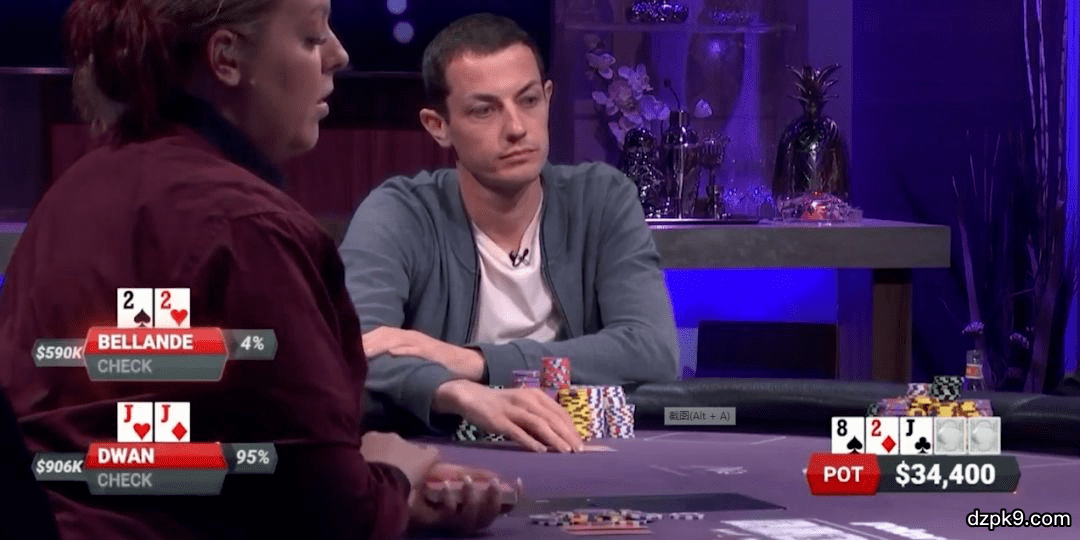 翻牌发出2♦8♠J♣,两位玩家都击中了set,而牌面上无听花无天顺牌面,是一个标准意义上的干燥牌面,大盲玩家过牌给毒王,而毒王击中顶set后选择随后过牌。