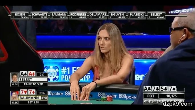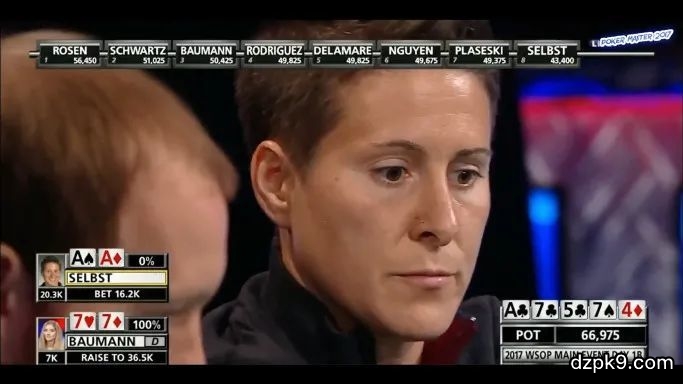 牌桌是个奇妙的地方,能孕育出很多刺激的故事,有时候光是围观就能感受到这种刺激,尤其是当你明显感到入局双方已暗藏杀机,你肯定能猜到高潮要来了!比如2017年WSOP主赛Day1那天,发生在Vanessa Selbst(绰号“女鲨鱼”)和Gaëlle Baumann之间那局牌,当时两人坐的是转播桌,牌局以如此戏剧的一幕收场,这种结局真真可以用“千载难逢”来形容,毕竟在WSOP主赛第一天拿到坚果葫芦被金刚清出局的事情,人一辈子能碰上几次?废话少说,下面我们就来看看为什么女鲨在这手牌被打出局可以说是命!当时是主赛Day1B的第一个level,圈内两位很厉害的女牌手同坐转播桌,盲注75-150,女鲨的筹码量43,400,她在中位拿到A♠A♦,开局加注到400,被BTN位的Baumann(码量50,425)和BB位的 Jake Schwartz (51,025) 跟注。底池增加到1275,有效筹码量是43,000。