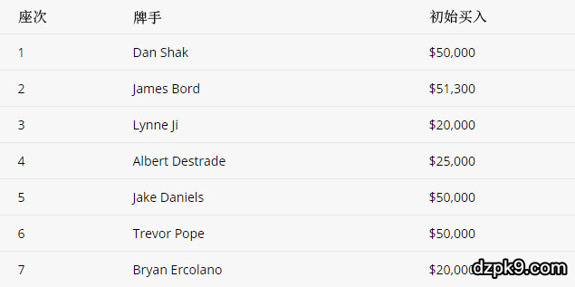 比赛形式是盲注100/200美元的无限德州扑克,带200美元的大盲前注(ante)。最小买入是两万美元。节目开始时各牌手的筹码量状况如下: