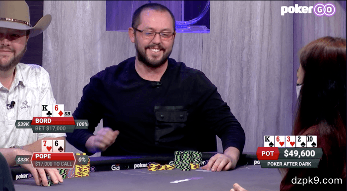 Bord在小盲位置用K♣ 6♦加注到3100美元,Pope在straddle位置用7♥ 6♣跟注。翻牌是K ♠ 6♥ 3♥。Bord击中了顶大两对,而Pope有个中对。Bord下注4000美元,Pope秒call。