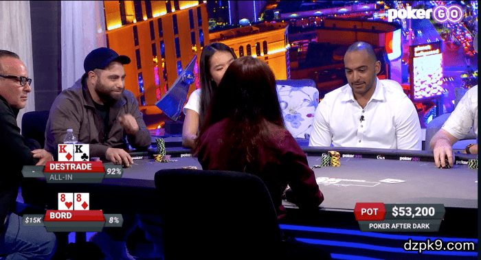 James Bord(straddle)到400美元,然后Destrade在前面位置用K♦ K♣加注到1500美元,Pope在按钮位置用K♥ Q♥跟注,Ercolano在小盲位置用5♠ 5♦跟注。Bord看到底牌是8♦ 8♥后3bet到7000美元。