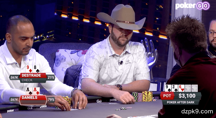 Daniel在枪口位置用A♠ A♦加注到1300美元,后面玩家弃牌,轮到Destrade在straddle位置行动。他看到底牌是9♦ 8♣,选择跟注。翻牌是9♠ 2♠ 6♥。Destrade拿到了一个顶对。Destrade过牌,然后跟注900美元。